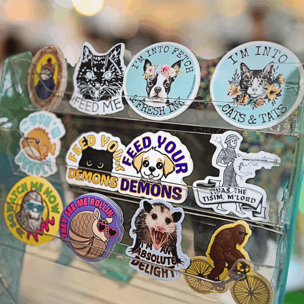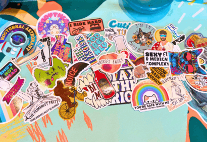 Angela is a disabled, neurodivergent mixed‑media designer and third‑generation small business owner. She creates bold, colorful waterproof vinyl stickers, apparel, and printed goods that blend inclusive storytelling, advocacy, and unapologetic humor. Her work is rooted in lived experience – her own and the communities she’s part of – and centers identity, accessibility, and the everyday realities of disabled and chronically ill life.