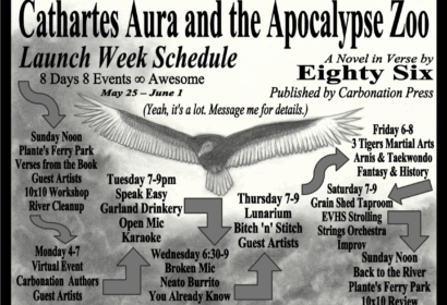 (Those are the first ten lines of Cathartes Aura and the Apocalypse Zoo. It is a post-apocalyptic novel in verse about a zoo on the day no one showed up, narrated by a captive turkey vulture. It is written in ten syllable lines and ten line stanzas. It is 1000 lines long and the first in a series of ten. It is being published by Greg Bem’s Carbonation Press. Launch Week is the end of May. I am also a fiction writer and performance poet. You may have seen me at Terrain, Broken Mic, Speakeasy and more.)