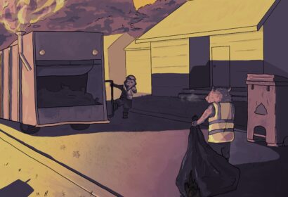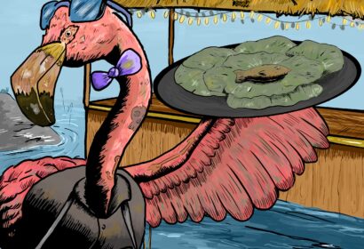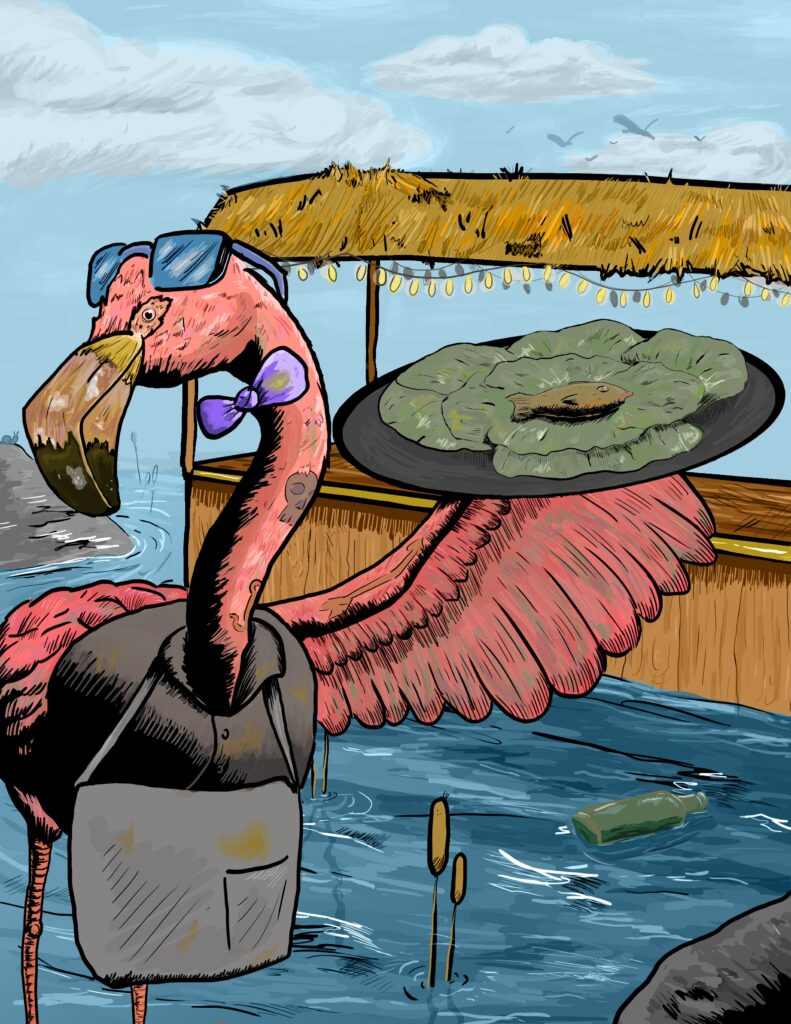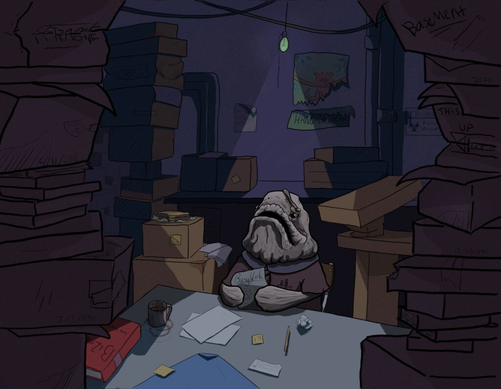more hours.” It is a fear of mine that I will be stuck in a monotonous job after a pursuing a fine art degree for four years. I put animals in these environments to create comic relief.