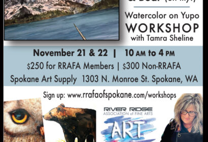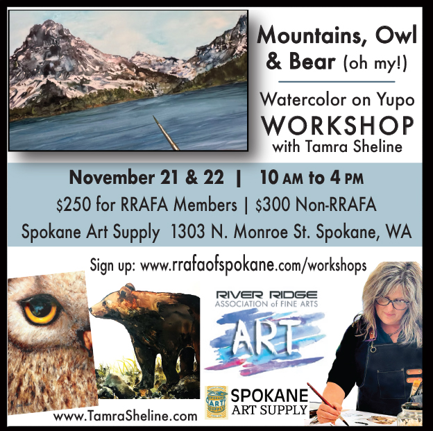| RRAFA is excited to invite you to join artist and instructor, Tamra Sheline, for a fun and explorative watercolor workshop at Spokane Art Supply. Tamra provides the Yupo paper, you bring your watercolor supplies- together we’ll create beautiful works of art in a relaxed, inspiring environment. The workshop will be held at Spokane Art Supply on November 21st & 22nd from 10 AM to 4 PM. Tamra will provide yupo paper (3 per student), backer boards, project worksheets, boxes to take artwork home in. You will need to bring your watercolor supplies (supply list at www.Tamra Sheline.com). |